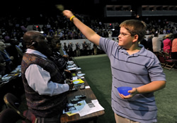 A newly confirmed youth sprinkles water on delegates as they reaffirm their baptismal vows during the 2008 General Conference in Fort Worth, Texas. Photo by Paul Jeffrey, UM News.