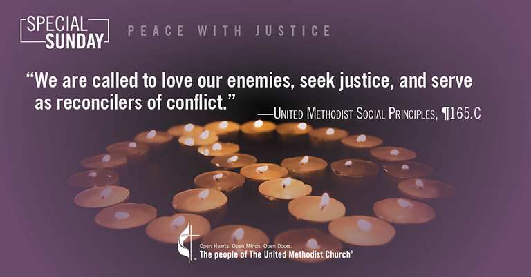 United Methodists observe Peace with Justice Sunday on the first Sunday after Pentecost. Pentecost celebrates the outpouring of the Holy Spirit, calling for God’s shalom. On this special Sunday, we witness to God’s demand for a faithful, just, disarmed and secure world.