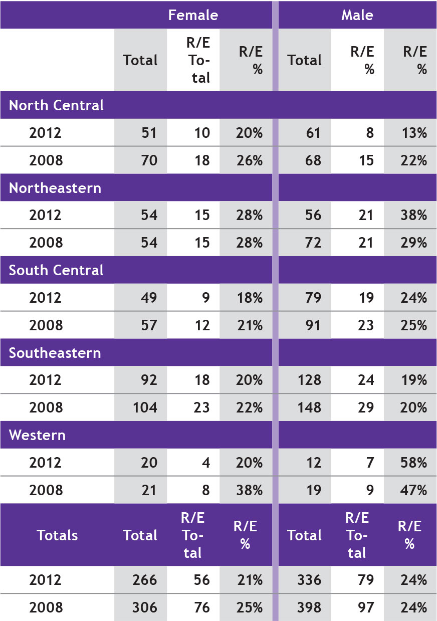 The North Central Jurisdiction dropped its representation from 138 to 112, a loss of 26 or 19% persons from the 2008 General Conference to the 2012 General Conference. Women had their representation decreasing the most with a net loss of 10 laywomen and nine clergywomen. These 19 represent 73% of the total loss of representation by the North Central Jurisdiction (see Tables 3 and 4).