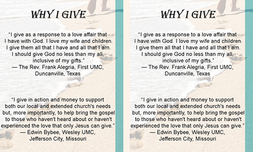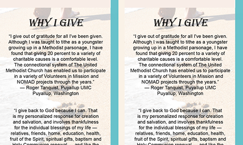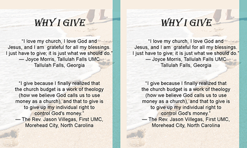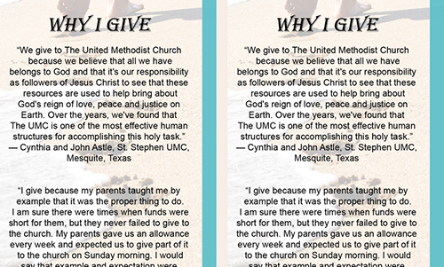 Audio Resource United Methodist Giving Raising Generous Disciples by Rev. Dr. Ken Sloan (audio file) Brochure and Flyer Resources (13 Different images) Who We Are Brochure United Methodist Giving 10 Resources You May Not Know Are Available Flyer United Methodist Giving 3 Things to Remember for New Pastors at Small Congregations United Methodist Giving 4 Traps for Clergy When Moving to a New Congregation United Methodist Giving 5 Tips for Starting a Theatre Outreach Ministry United Methodist Giving 7 Suggestions to Creating an Online Bible Course United Methodist Giving 7 Tips for Sustaining your Ministry 50 Ways to Welcome New People 50 Ways to Encourage Faithful Giving 50 Ways to take the Church to the Community United Methodist Giving A Checklist for Financial Secretaries A Mother's Day Prayer Administration Assess your church’s financial health United Methodist Giving Cultivating Generous People Flyer FAQ About Electronic Giving for Local Churches Giving in the United Methodist Church How Your Quarterly Financial Statement can Enhance Giving Stewardship Reflections Teaching Children to Tithe UMC Giving Digital Bookmark Guide United Methodist Giving Understanding the United Methodist Church Budget Jill Williamson Flyer Cynthia Astle & James Arnold Flyer Patrick Gallo & Suzanne Hartley Flyer Rich Musgrave & Cathy Webb Flyer Julie Schumann, Ken Wilson & Ekaterina Zubkova Flyer Bill Campbell & Frank Dunnewind Flyer Beth Borchert and Mary Brooks Flyer Frank Alegria & Edwin Bybee Flyer Joyce Morris & Jason Villegas Flyer Roger Tanquist and DeLoris Witherington Flyer Michael Mann & Karen Tierney Flyer John & Ranelle Hockert and James Lwande Flyer Bulletin Insert Resources (8 Different images) Frank Alegria & Edwin Bybee Bulletin Insert Jill Williamson Bulletin Insert Joyce Morris & Jason Villegas Bulletin Insert Roger Tanquist & DeLoris Witherington Bulletin Insert Patrick Gallo & Suzanne Hartley Bulletin Insert Rich Musgrave & Cathy Webb Bulletin Insert Beth Borchert & Mary Brooks Bulletin Insert Cynthia Astle & James Arnold Bulletin Insert