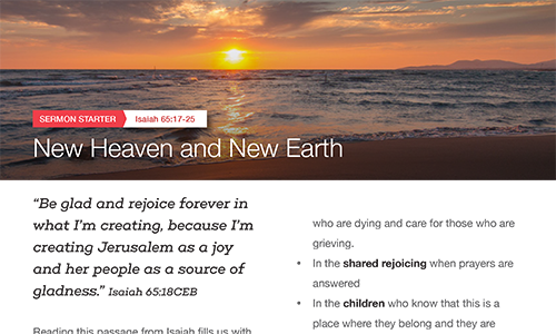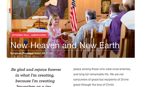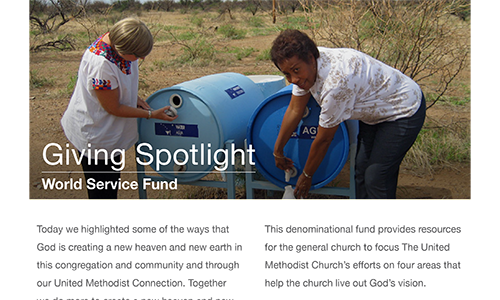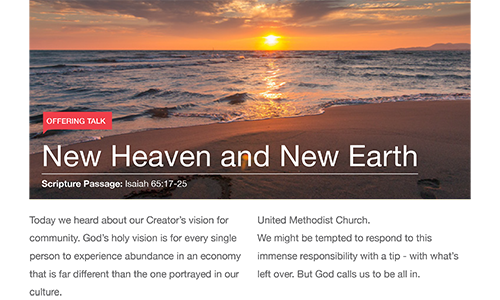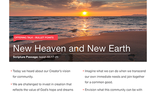 Welcome to the New Heave and New Earth Pastor and Leaders' Kit. We have assembled together resources to help you talk to you congregation about the connection and generosity of The United Methodist Church and the impact they are making in the lives of individuals around the world.
