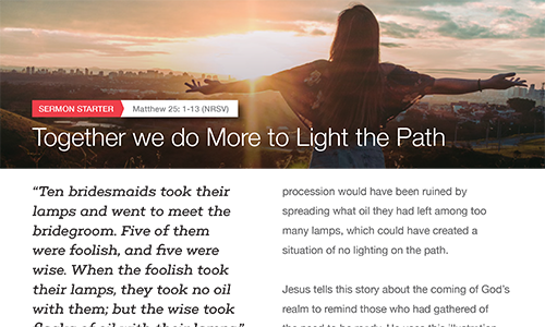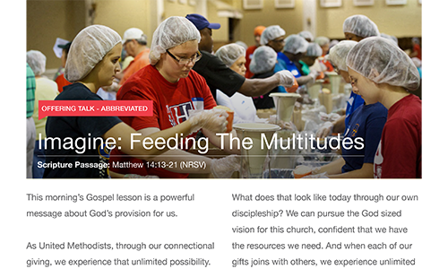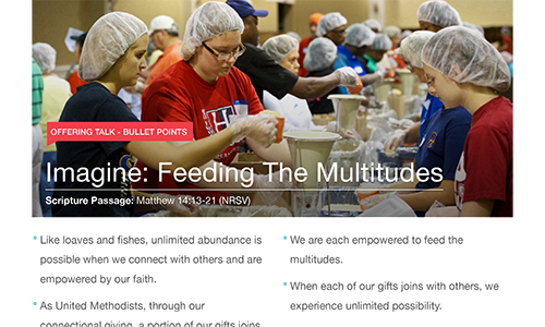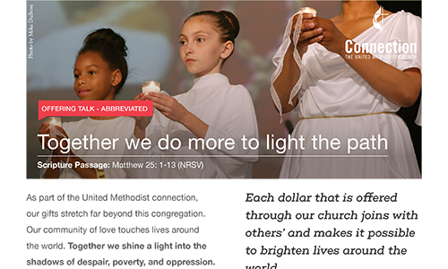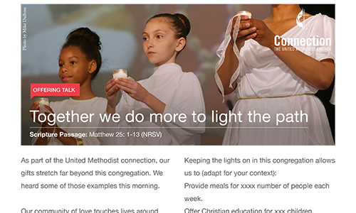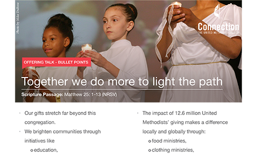 These resources will help you approach the subject of giving and generosity with your congregation. We have included a bulletin insert a "blank" bulletin cover for customization, Sermon Starters, Offering Slides and much more. Please use these resources throughout the year especially in the Fall when you talk about your stewardship campaigns.