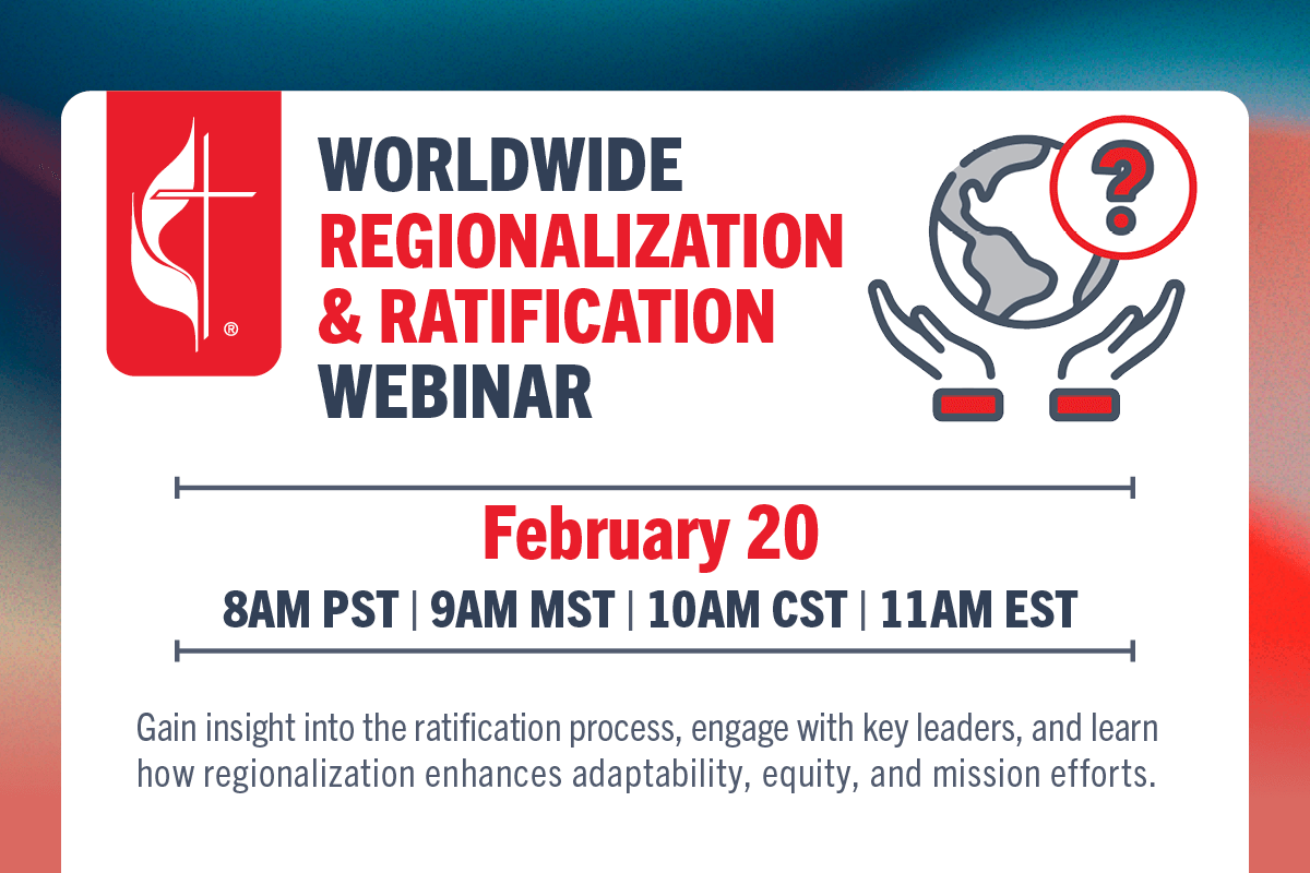 연합감리교회 공보부, 연대사역협의회, 해외지역총회연락상임위원회 , 성탄절 언약 작성팀, 그리고 총감독회가 참여하는 공동 웨비나에 참여하라. 이 웨비나에서는 연합감리교회에서 세계 지역화의 중요성과 그것이 미국 교회에 미치는 영향, 그리고 준비하지않을 시 맞이할 결과를 살펴볼 것이다. 참석자들은 비준 과정에 대해 더 깊이 이해하고, 주요 지도자들과 교류하며, 지역화가 어떻게 적응력, 형평성, 선교 효율성을 증진시키는지 알아가게 될 것이다. 이러한 변화를 잘 다루기 위한 지식과 자료를 갖추고, 중요한 질문을 제기하고, 지역 차원에서 교회의 미래를 옹호할 수 있다.
